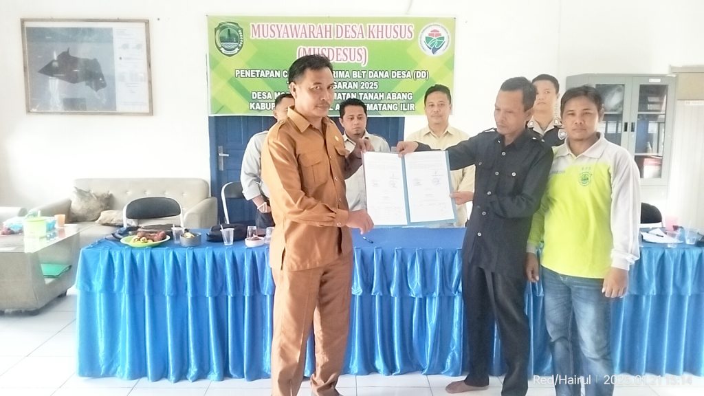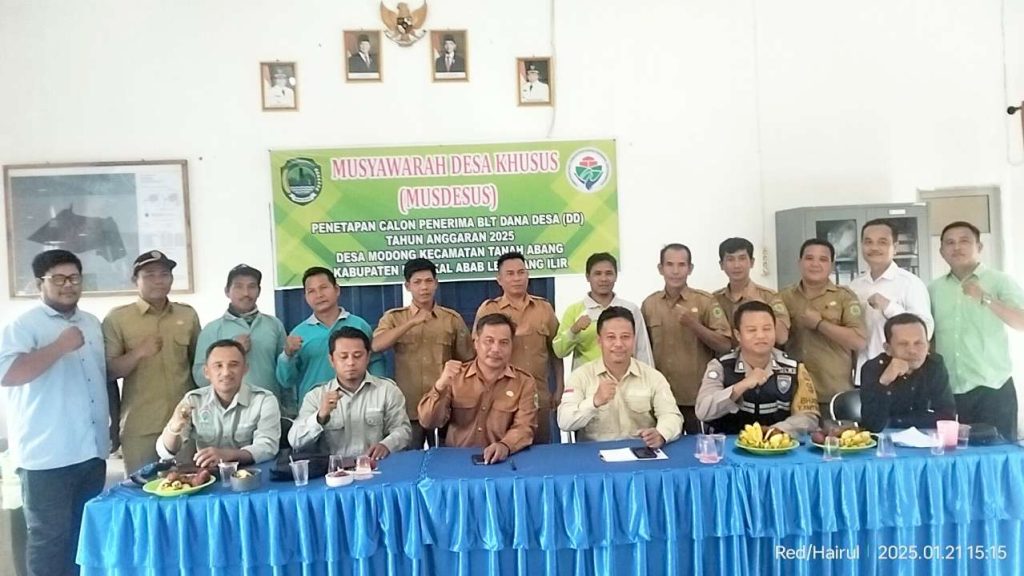 Targetonline.id-PALI – Pemerintah Desa Modong, Kecamatan Tanah Abang, Kabupaten Penukal Abab Lematang Ilir (PALI), Sumatera Selatan, menggelar Musyawarah Desa Khusus (Musdessus) untuk menetapkan Keluarga Penerima Manfaat (KPM) Bantuan Langsung Tunai (BLT) Dana Desa (DD) tahun anggaran 2025. Kegiatan berlangsung pada Selasa (21/1/2025) di Kantor Kepala Desa Sedupi.
