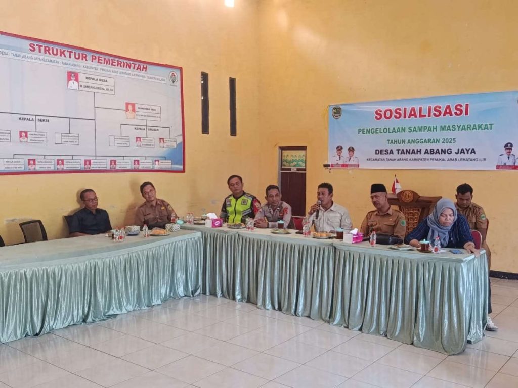 PALI Target online.id – Pemerintah Desa Tanah Abang Jaya menggelar sosialisasi pengelolaan sampah berbasis masyarakat tahun anggaran 2025 di Kantor Kepala Desa Tanah Abang Jaya, Kecamatan Tanah Abang, Kabupaten Penukal Abab Lematang Ilir (PALI), pada Selasa, 29 Juli 2025.