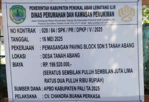 Targetonline.id – PALI, Sumsel – Proyek pembangunan paving block di SD Negeri 5 Tanah Abang, Desa Raja Barat, Kecamatan Tanah…