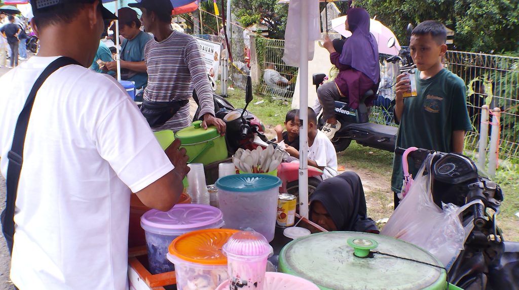 “Biasanya yang beli lumayan ramai, tapi tahun ini agak berbeda. Start karnaval juga berbeda dari biasanya, jadi jalan agak padat dan kurang rapi,” ujar Mila sambil melayani pembeli di lapaknya.