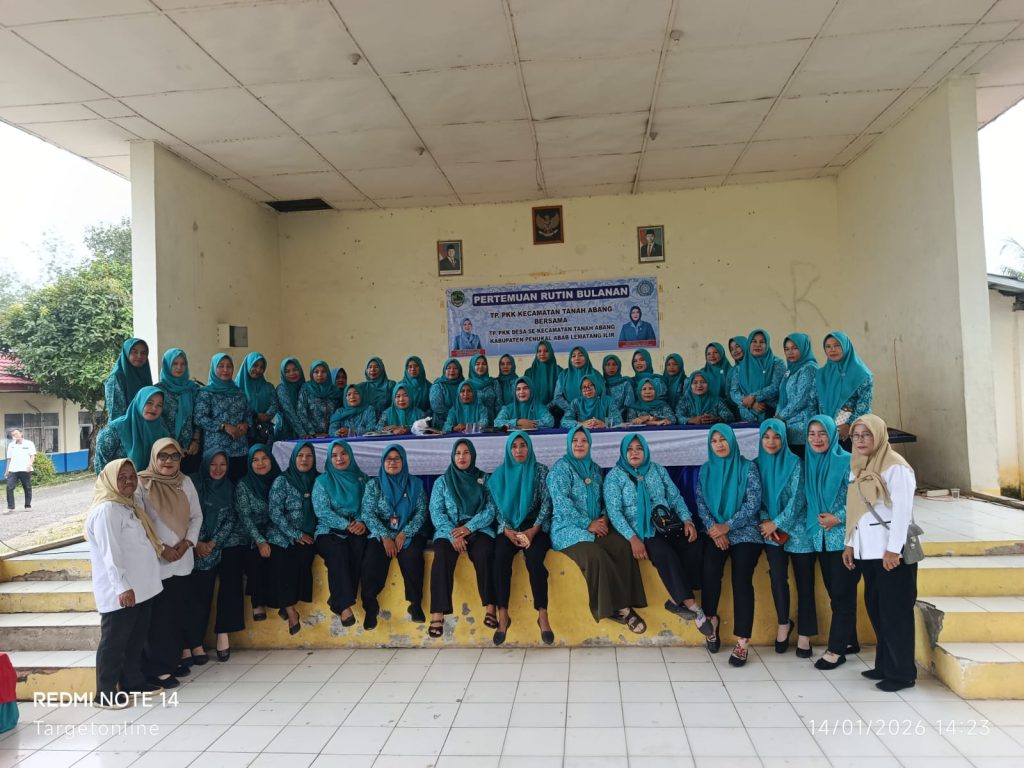 PALI Targetonline.id — Tim Penggerak Pemberdayaan dan Kesejahteraan Keluarga (TP PKK) Kecamatan Tanah Abang menggelar pertemuan rutin bulanan bersama TP PKK desa se-Kecamatan Tanah Abang sekaligus memperingati Isra Mi’raj Nabi Muhammad SAW 1447 Hijriah/2026 Masehi. Kegiatan tersebut berlangsung di Balai Kecamatan Tanah Abang, Kabupaten Penukal Abab Lematang Ilir (PALI), Rabu (14/1/2026).