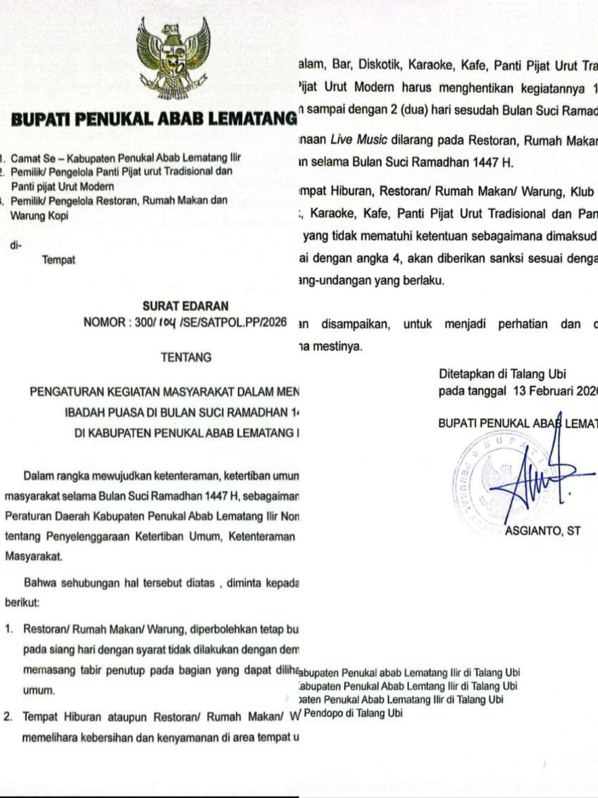 PALI Targetonline.id – Pemerintah Kabupaten Penukal Abab Lematang Ilir (PALI) resmi menerbitkan Surat Edaran Nomor: 300/104/SE/SATPOL.PP/2026 tentang pengaturan kegiatan masyarakat…